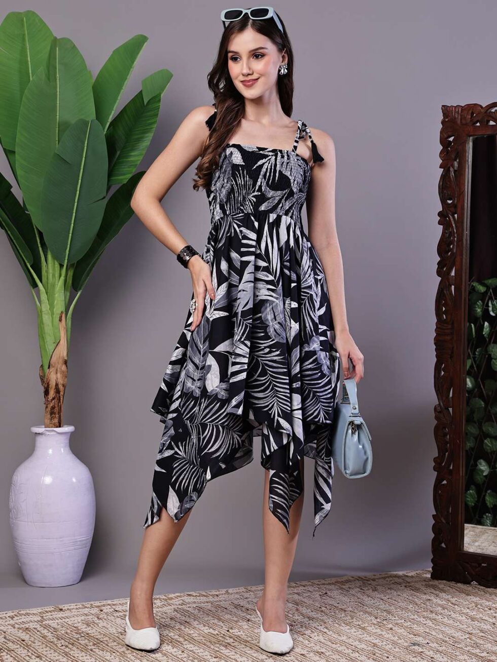Women’s Black & White Leaf Print Cotton Handkerchief Hem Dress Midi Dresses