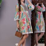 This stylish, tiered tunic mini-dress offers a beautiful flared silhouette with a playful, movement-filled skirt. It features an intricately detailed V-neckline with lace and threadwork, and is finished with a trendy fringe/tassel trim on the sleeves and hem. It’s a versatile and comfortable statement piece perfect for a modern bohemian look.